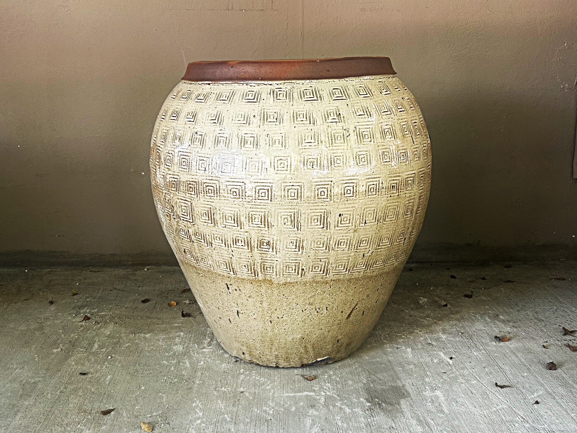 Patterned rustic ceramic jar planters. Variegated shades of creme. Perfect for residential or commercial use.