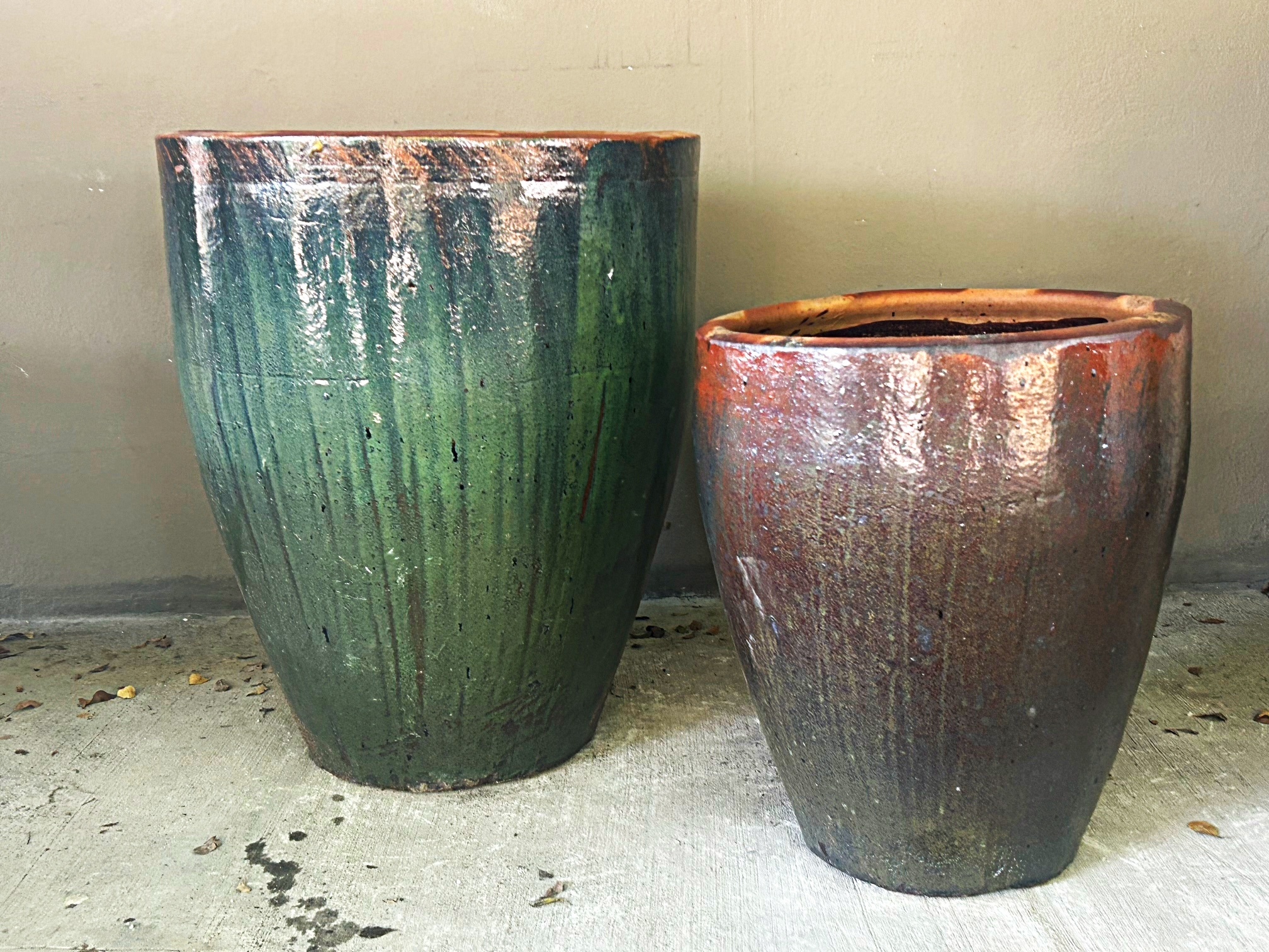 Rustic ceramic cup planters.  Variegated shades of green.  Perfect for residential or commercial use.