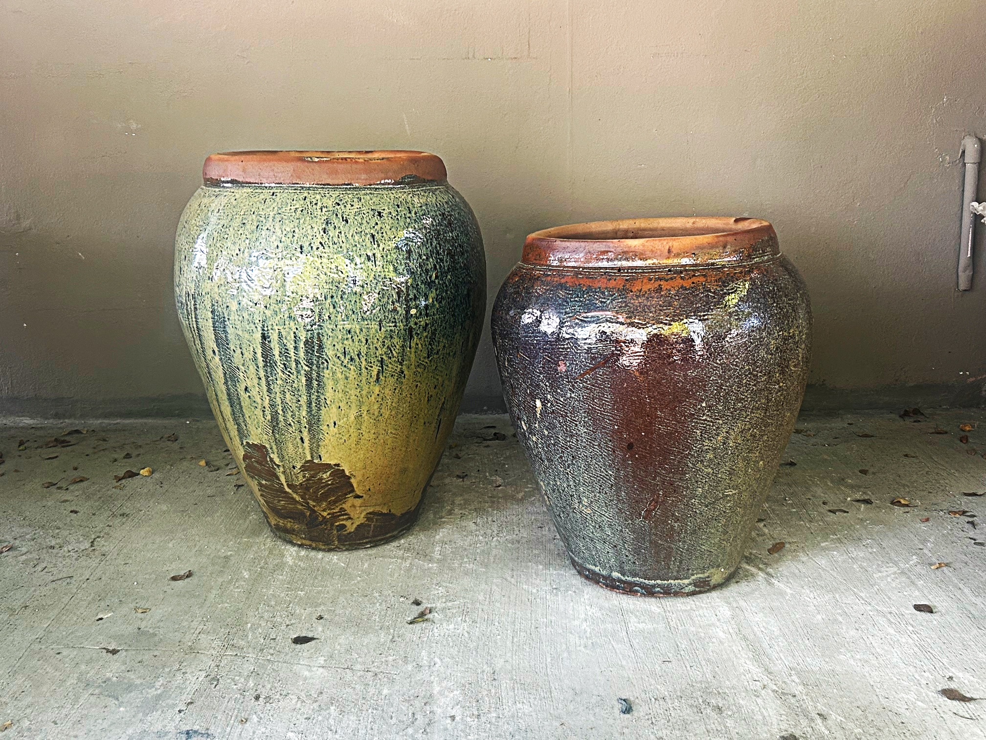 Rustic ceramic jar planters. Variegated shades of brown or green. Perfect for residential or commercial use.